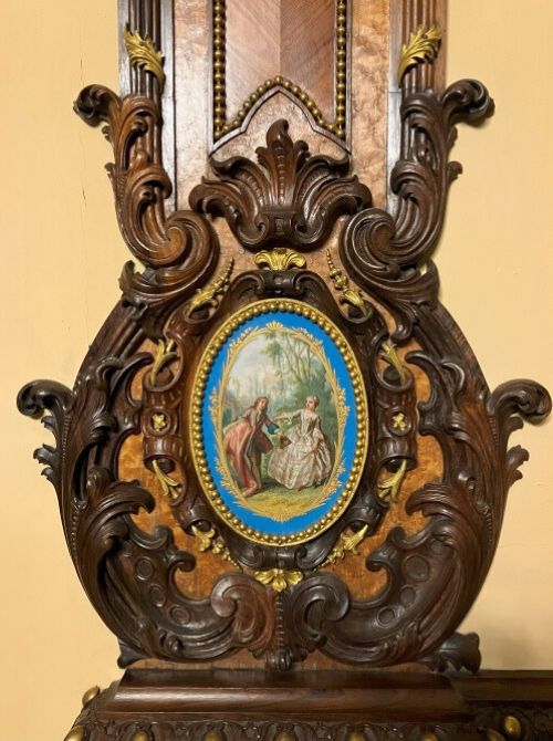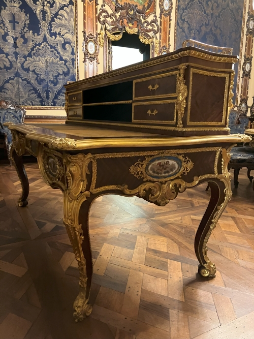 Su progetto di Ferri, Gabriele Capello rivestì le pareti con raffinate boiseries in legno di pioppo, rosa, noce, larice, palissandro e acero. Questo artista, abile intagliatore ed ebanista, combinò sapientemente le diverse colorazioni dei legni con i bronzi cesellati da Giuseppe Colla e con le porcellane incastonate come gioielli nelle boiseries. Sulle cinque porte a battenti, le sovrapporte dipinte a putti scherzanti furono realizzate dai figli del direttore dei lavori Ferri, Gaetano e Augusto. A loro si devono anche le decorazioni pittoriche del soffitto, incorniciate da volute e medaglioni in stucco con stemmi sabaudi lavorati dagli scultori Pietro Isella e Silvestro Simonetta. Lo stile francesizzante si impose soprattutto nella scelta degli arredi mobili, come lo scrittoio con alzata del mobilificio Wassmuss acquistato direttamente a Parigi, e le dodici sedie, due dormeuses, tre poltrone e un sofà in stile neo barocco, rivestite con imbottiture in lampasso (tessuto operato) con fondo a raso blu a fogliami, a evocare la colorazione delle tappezzerie alle pareti. In origine nella sala erano collocati anche alcuni arredi settecenteschi realizzati da Pietro Piffetti, oggi al Quirinale: un doppio corpo, due cassettoni e una coppia di piedistalli.