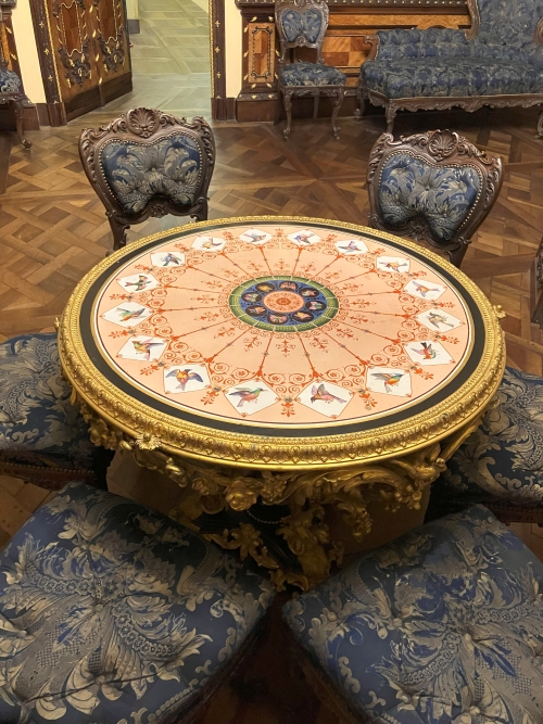 L’ambiente già “Camera di trattenimento della regina Maria Adelaide” definito anche “Salotto blu” per la tappezzeria originale in seta su fondo azzurro, fu realizzato nel 1852 come sontuoso salotto per la regina Maria Adelaide. Rappresenta la testimonianza più significativa della capacità dell’architetto Domenico Ferri, successore dal 1854 di Pelagio Palagi nella direzione dei lavori di corte, di interpretare il revival di stili ottocentesco in chiave neo-rococò.
