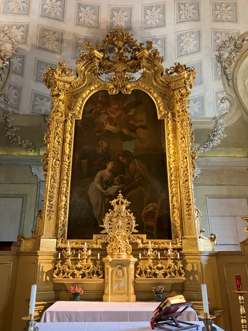 La Cappella Reale venne realizzata intorno al 1775 nell’ambito dei più estesi lavori di allestimento dell’appartamento dei Principi di Piemonte, voluti da Vittorio Amedeo III in seguito alle nozze tra Carlo Emanuele di Savoia e Maria Clotilde di Francia. La sua progettazione è attribuita a Francesco Martinez, nipote del celebre architetto messinese Filippo Juvarra. Decorata nell’ampia volta con pitture a monocromo di Giuseppe Pietro Pozzo e impreziosita da medaglioni in stucco con puttini, la cappella si presenta come un ambiente a navata unica, elegante e raffinato. Sopra l’altare, entro una monumentale cornice in legno intagliato e dorato, si conserva un dipinto raffigurante l’Educazione della Vergine. La cappella è una delle poche testimonianze rimaste quasi integre della fase tardo settecentesca della residenza di Moncalieri.
