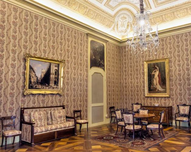 La sala è caratterizzata da un’atmosfera gioiosa e raffinata ed è qui che Maria Letizia riceveva i propri ospiti. Scampato al terribile incendio del 2008, l’ambiente testimonia in parte anche la precedente fase decorativa settecentesca. In particolare, tra il 1788 e il 1789, vennero eseguiti alcuni ammodernamenti su progetto degli architetti Giuseppe Battista Piacenza e Carlo Randoni in occasione delle nozze dei duchi d’Aosta, poi futuri re e regina di Sardegna, Vittorio Emanuele I di Savoia e Maria Teresa d'Asburgo d'Este.